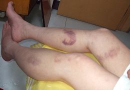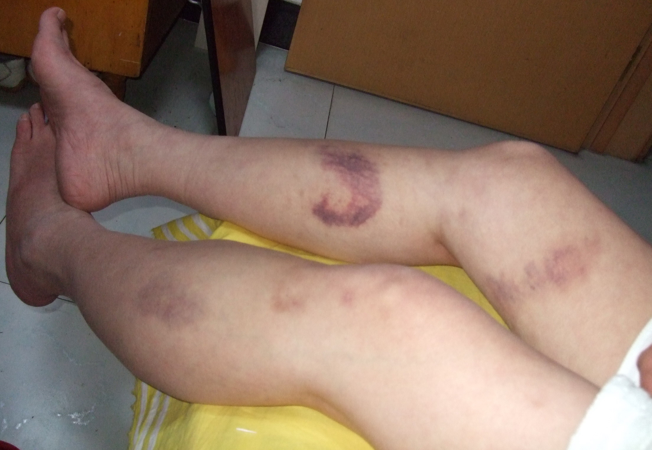 47、踢迎面骨:穿着硬塑料鞋踢迎面骨,致腿部红肿或黑紫。