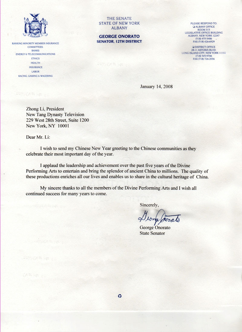 George说:“神韵艺术团在过去五年中将古老中国的神韵带给千百万的民众,我祝贺你们取得的成就。这些杰出的节目丰富了我们的生活,并让我们能够分享中国传统文化。”