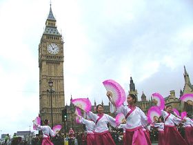 ![]() 跳着传统扇子舞,法轮功女学员们翩翩经过伦敦的著名标志“大笨钟”(Big Ben) |