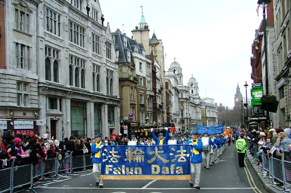 在约一个半小时的游行过程中,天国乐团成员一直保持着整齐有力的步伐,并不断的对观众的热情鼓励和喝彩报以微笑。在游行快要结束的时候,伦敦的天空下起了细雨,而天国乐团仍然保持队伍整齐、精神抖擞的面貌直至游行结束。游行活动组织者在游行结束后对法轮功学员表示:他对天国乐团在法轮功队伍中的出现感到很吃惊,乐队的表演非常好,很高兴他们能来来参加游行。他还评价说近几年来法轮功游行队伍一年比一年好,今年的表演是最棒的!