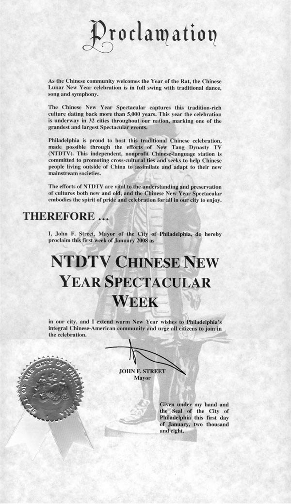 褒奖中还说,费城很荣幸能够与新!唐!人:电视台携手举办这一中国传统文化的庆典。新!唐!人:电视台是独立、非营利的华语电视台,她致力于推广跨文化的联系、帮助海外华人融入主流社会。新!唐!人:电视台的努力对于理解和保存古老的文化和新的人类文化都至关重要,而全球华人新年晚会则体现着我们全费城人一起分享和庆祝的自豪精神。