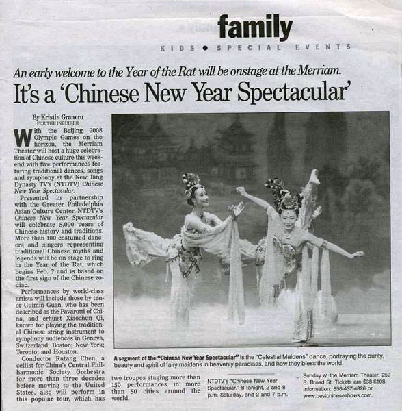 新!唐!人:与大费城亚洲文化中心合力推出这个演出,晚会庆祝中国五千年的历史和文化传统。一百多名衣着华丽的舞蹈家和歌唱演员将重现传统中国的神话和传说,迎接将于二月七日开始的鼠年——中国十二生肖属相中的第一个。