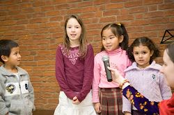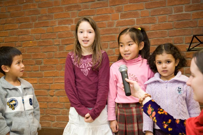 在新年晚会上,大一些的孩子们背诵或朗读了《论语》,小一些的孩子们背诵了《洪吟》中的《法轮世界》,八岁的姗姗还表演了钢琴《法轮大法好》。
