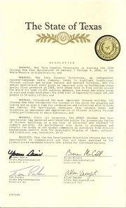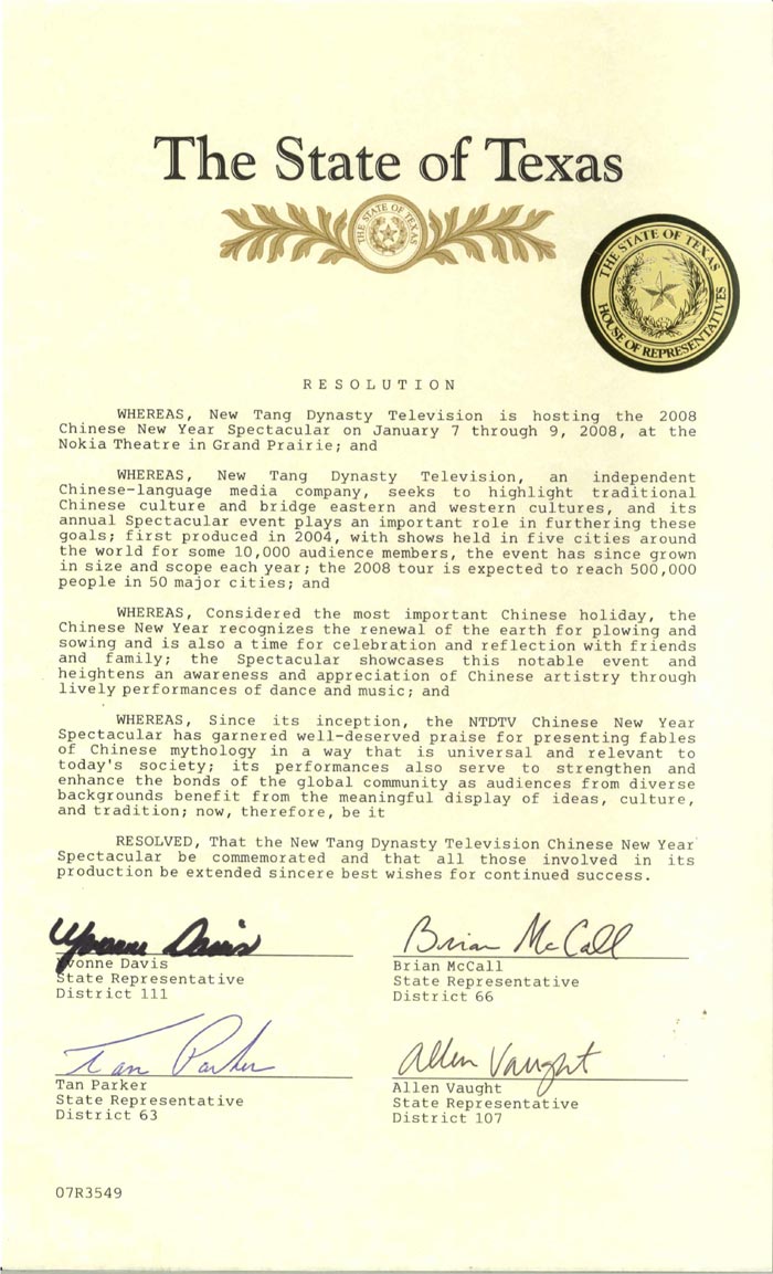 鉴于,自开始举办以来,新!唐!人:电视台全球华人新年晚会通过世界性的和与当今社会相关的方式表现中国的神话传说,并已获得广泛的赞许;晚会的表演也增强了全世界的联系,因为来自不同背景的观众都能够受益于赋予了意义的对文化和传统的表现;