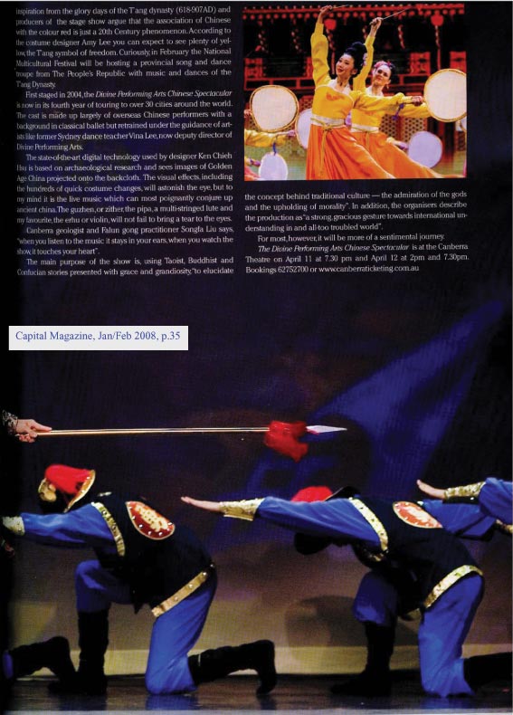 神韵艺术团神韵晚会将于四月十一日晚七点半,四月十二日下午两点和晚上七点半在堪培拉大剧院上演。订票电话:62752700或者上网订票,网址是www.canberraticketing.com.au。
