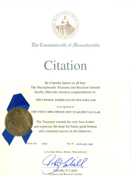 麻萨诸塞州财务部长在此最诚挚的祝贺新英格兰地区的华人,祝贺2008年新!唐!人:华人新年晚会。