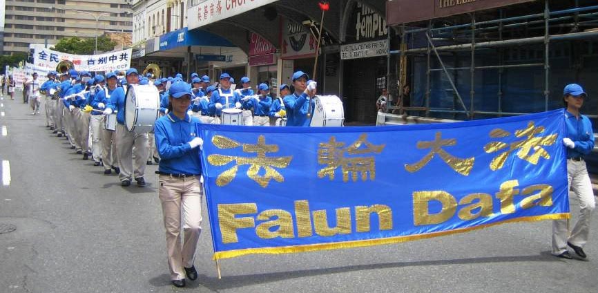 ![]() 游行队伍中谴责中共迫害法轮功的横幅 |