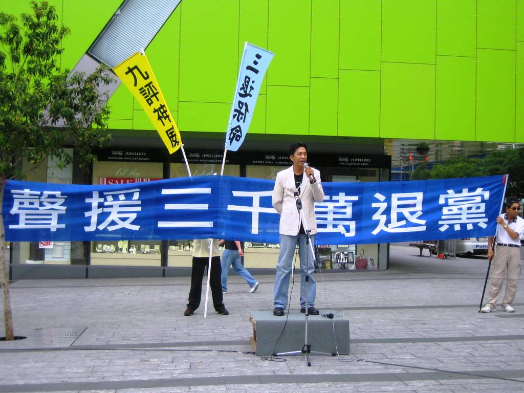 来自各界人士的发言更把集会的气氛带上高潮。第一位发言人为昆士兰自由中国协会会长李先生(John Lee),他表示现在已有越来越多的中国人看清中共的邪恶面目,纷纷加入三:退.(退出中共党、团、队)行列。他指出,除了残害自己人民之外,中共也将黑手伸向海外,例如大量的中共特务渗透,出口有毒玩具和食品等。李先生最后以“退!党!服务中心新年公告”呼吁中国民众赶快觉醒。“希望你们在新的一年中,都能自觉参与到广传《·九·评*》力促三:退.的历史壮举之中,为彻底解体中共恶党、清除邪*党-文化在方方面面的遗毒,重建中华正统道德,复兴中华神传文化而努力。”