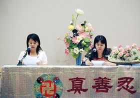 ![]() 明慧小弟子们上台背诵《转法轮》第六讲“主意识要强”一节。 |