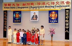 在法会下午时间,明慧小弟子们上台背诵《转法轮》第六讲“主意识要强”一节,赢得了满场掌声。
