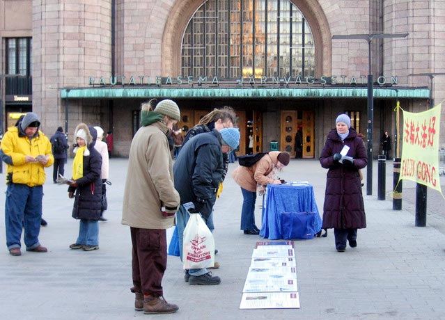 五百多万人口的芬兰,即使是首都赫尔辛基,也只有五十多万居民。平时难得有人群集中的场合。自二零零零年芬兰有了法轮功学员开始,他们就利用各种机会,在各种类型的展销会上、在夏季旅游旺季的城市公园、商业街、冬季在地铁和火车站的交汇大厅、周末的市中心火车站旁及各种社区活动中,坚持不懈地向芬兰人民洪扬法轮大法的祥和,及对人类道德和健康的提升的美好;同时揭露中共自一九九九年“七二零”以来,对中国大陆法轮功学员惨无人道的迫害真相。用慈悲之心,呼唤着世人的良知善念,呼吁正义的人们共同起来制止中共八年多来对法轮功学员灭绝人性的残酷迫害。