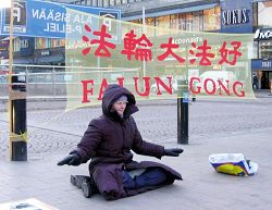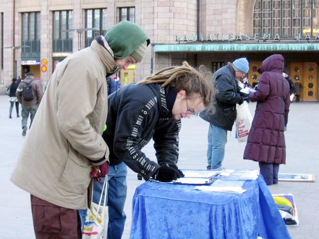 ![]() 热心善良的芬兰人民在寒风中向法轮功伸出援手 |