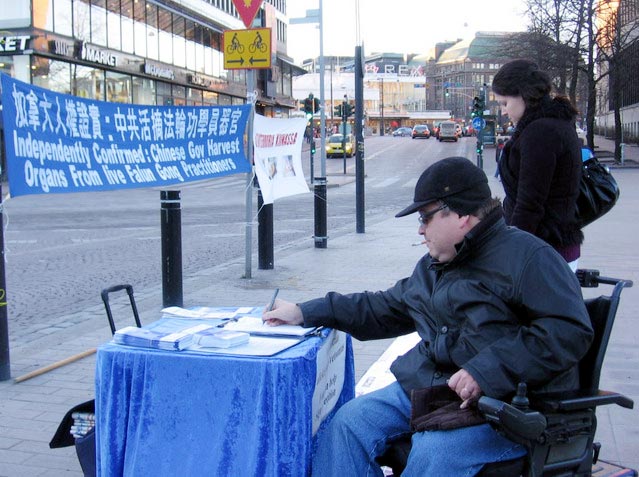一位芬兰的残疾人坐着轮椅主动来签名声援时,跟随他的女士问他:这是什么?这位残疾人就向她解释道:这是法轮功,是一群有信仰的人。但在中国却受到政府迫害,就象二战时希特勒杀犹太人一样。女士听后也上前签了名。