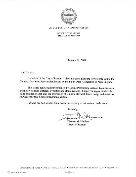 我代表波士顿非常高兴欢迎你们前来欣赏新英格兰法轮大法协会主办的华人新年晚会。