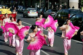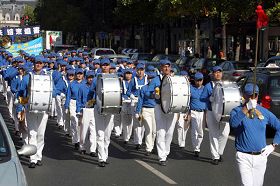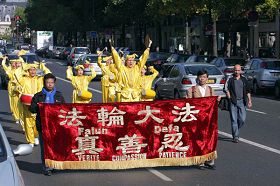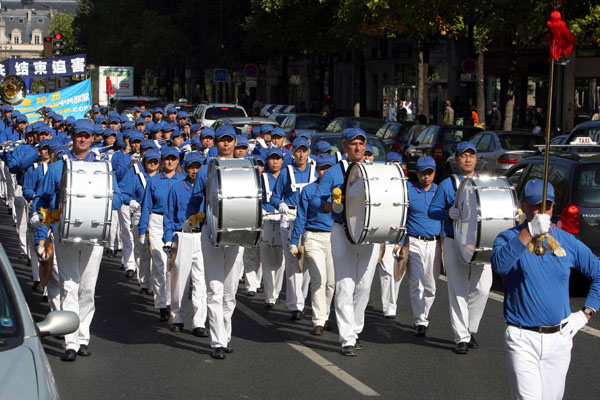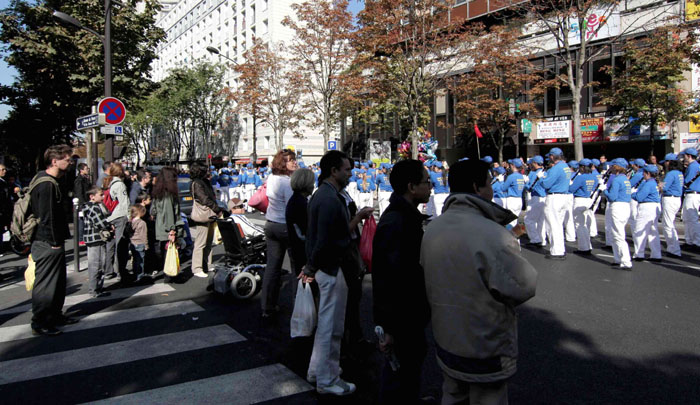 队伍从巴黎的意大利广场出发,经过华人居住集中的巴黎十三区后,最后返回到意大利广场。适逢周末,巴黎市内行人众多,人们为欧洲天国乐团演奏感到震撼,很多商店的人从商店里出来观看游行,有些店里的工作人员身穿围裙就跑出来照相,很多人面带微笑接过传单,不少人连声说谢谢,有不少人给游行队伍鼓掌。游行队伍中的广播车,一直用法文和中文给观看游行的巴黎民众介绍法轮功是什么、法轮功洪传世界、为什么中共惧怕真、善、忍而打压法轮功、中共谎言欺骗民众等信息。许多路人接过真相资料后,马上阅读起来。