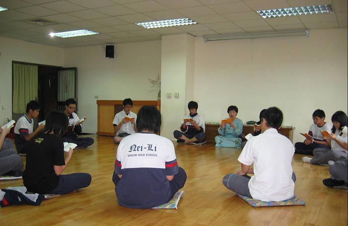 在内坜高中,有一群修炼法轮功的教师和学生,他们在学校不同的岗位尽力守份,他们是来自不同科目办公室的教师、来自不同的年级、不同班级(包括美术班、语资班、数资班、普通班)的学生,但是每天的中午午休时间,他们会聚在一起伴随着悠扬的音乐炼功,有时你会听到他们朗朗的读书声。没错,午餐后的约会,是他们共同期盼的美好时光。