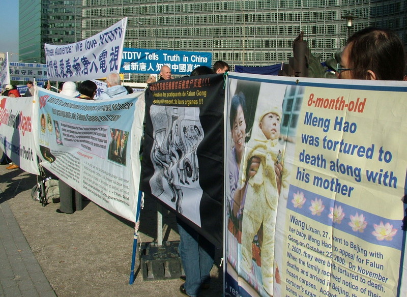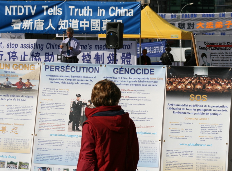 “停止活体摘取法轮功学员器官”(中法文对照横幅)