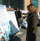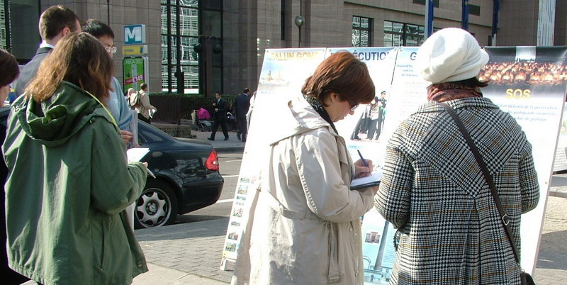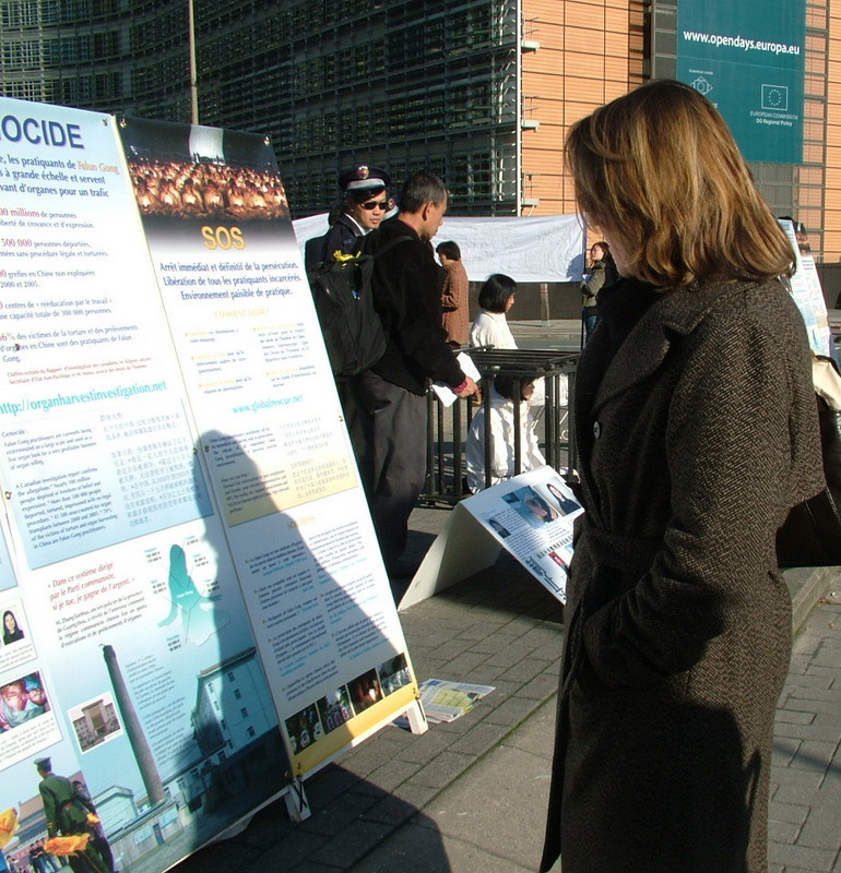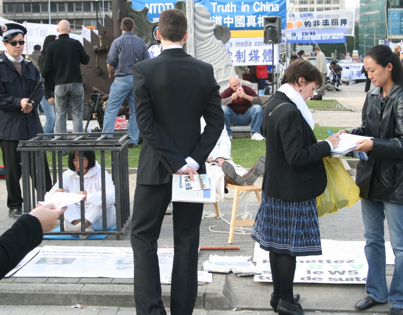 集会从早晨九点持续到下午三点,午餐时间,欧盟大厦的工作人员很多人出来观看。路人也在倾听扩音喇叭的讲话声音。很多人接受资料,关注和了解为什么欧洲卫星这样做,这是违反自由西方社会人民生存的基本原则的。