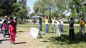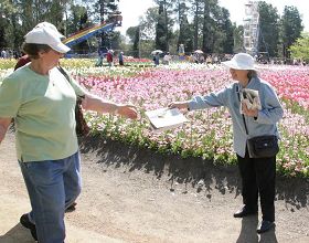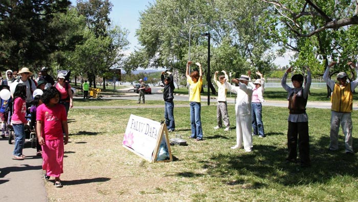 当日,春风和煦,阳光明媚。与往年一样,法轮功学员组成的天国乐团和腰鼓队在通往花展人行道旁的绿草地上演奏着“法轮大法好”等乐曲。他们阵容整齐,乐曲雄壮,深受当地纯朴民众们的喜爱。身着金黄色服装的腰鼓队打出阵阵鼓乐,向人们展现着修炼者的风貌。五套功法演示和义务教功在人行道的另一侧,更是吸引了不少游客。学员告诉人们:法轮功这个来自古老中国、让人身心受益的修炼方法,是以“真、善、忍”为原则,五套功法动作舒缓,简单易学,现已洪传八十多个国家。很多人询问在哪里能找到炼功点,表示要学功。还有很多游客主动向学员索要真相资料。