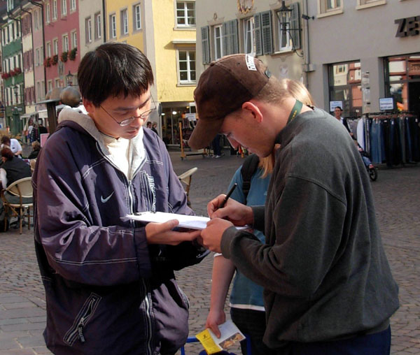 看上去二十多岁的Maximiliam和Lisa一起签名支持法轮功学员。Maximiliam谈到:“我觉的那(活摘器官)是错误的,人不应该那样做,简直没人性。”