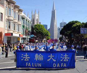 ![]() 法轮功学员的花车经过旧金山地标环美金字塔大楼 |