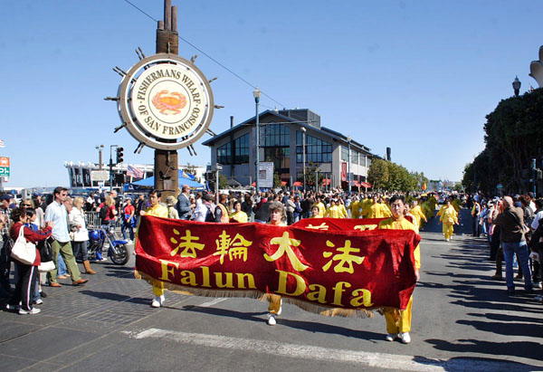 ![]() 法轮功学员的队伍经过旧金山著名旅游景点渔人码头 |