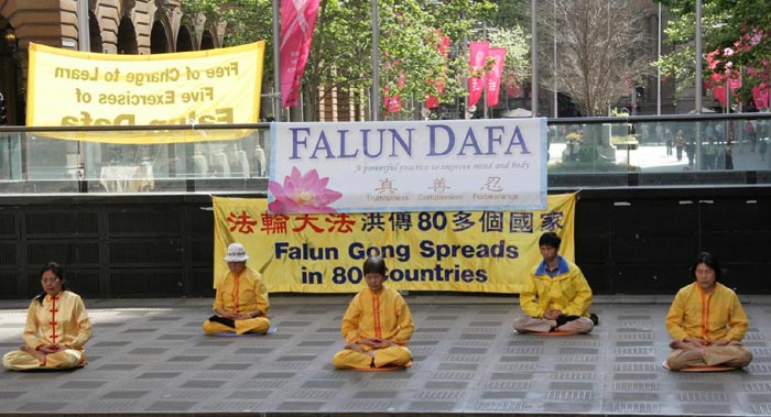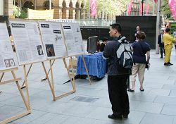 位于市中心的马丁广场,是悉尼的金融中心,邮政中心、律师楼、国家银行总行、七号电视总台、各大机构的办公室均设立在这里,周围又是繁华的商业街。这里每天的行人和游客川流不息。法轮功学员在这里设置了信息台,摆放各种真相资料,大屏幕投影机不断的向过往行人播放法轮功在世界洪传的盛况以及发生在中国的迫害真相。信息台的旁边是展板,展板吸引了许多善良的澳洲人仔细观看,大法的美好和中共的邪恶形成鲜明的对比,触目惊心的迫害图片令人震惊。学员们有的向来往的行人发资料,有的给行人讲真相,介绍展板上的内容,有的为反迫害征签。了解了真相的澳洲人纷纷在征签表上签名,呼吁制止中共迫害法轮功。法轮功学员还在广场中心做功法展示,将法轮大法的美好、祥和展现给当地居民。