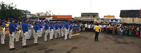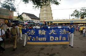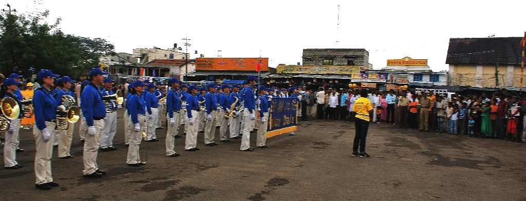 亚太天国乐团于早上首先登临位于山上的查穆德斯瓦利寺庙为广大民众演奏。乐团成员踏着整齐的步伐,沿着山上演奏了“法轮大法好”、“法鼓法号震十方”、“法正乾坤”、“送宝”、“欢乐颂”、“佛恩圣乐”等曲子。演奏获得民众的好评。