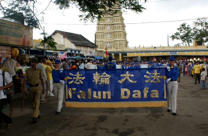 于下午时段,亚太天国乐团受邀到迈索尔皇宫前为广大民众表演。当天国乐团踏着整齐的步伐途经繁忙的马路时,吸引了群众的注意。人们纷纷停下脚步和汽车索取大法的真相资料。沿途的观众反应热烈,很多人看到法轮大法亚太天国乐团及腰鼓队经过时,都鼓掌欢呼,竖起大拇指叫“法轮大法好”。
