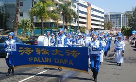 法轮功方阵由身着中国宋代服饰的天国乐团、舞蹈队和花船组成,向民众展现传统的中国文化。在全程近一个小时的巡游中, 天国乐团的“法轮大法好”、“法正乾坤”、“法鼓法号震十方”等曲目一路奏来,唤醒人们对久远历史的记忆,一路上人们报以友好的微笑和掌声。