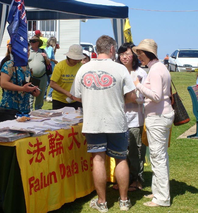 ![]() 游人来到法轮功咨询台前了解功法特点和如何学功 |