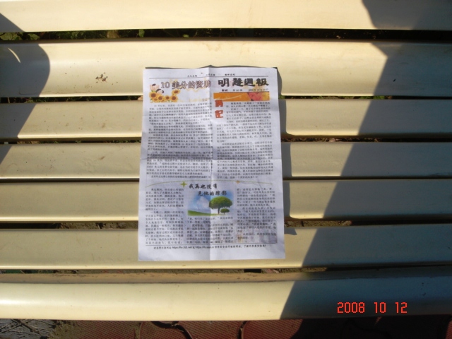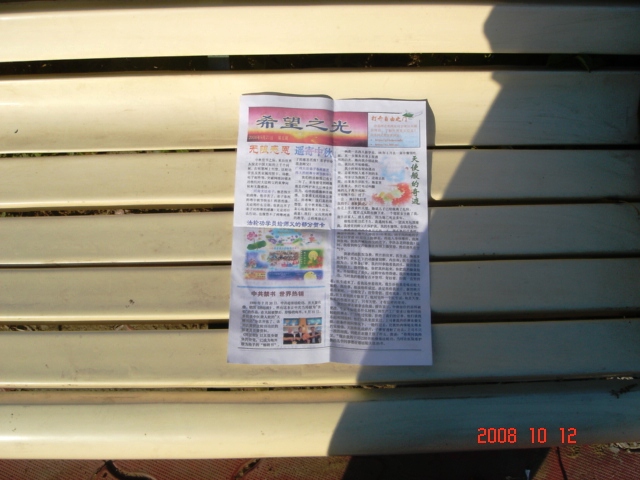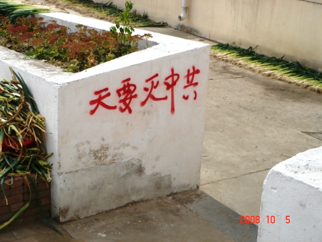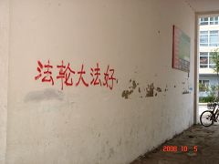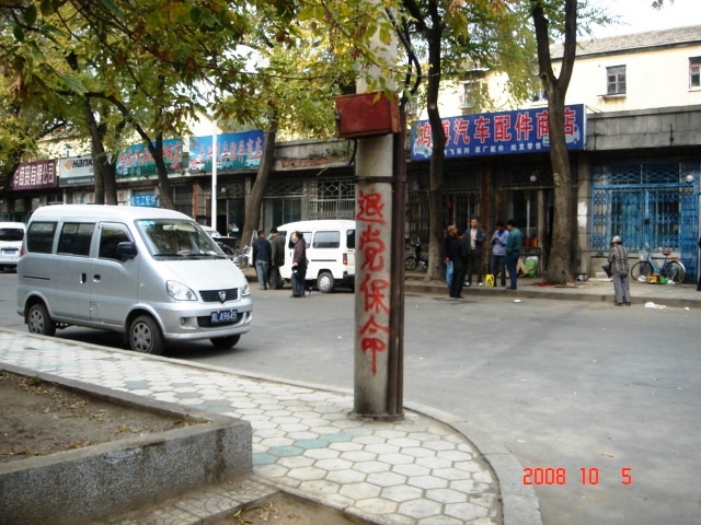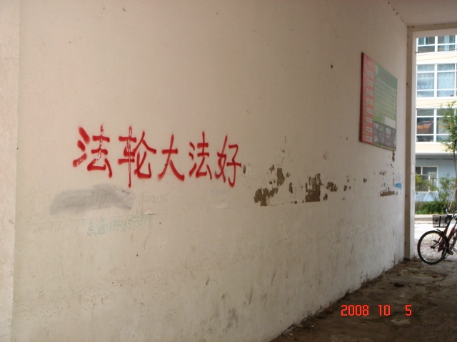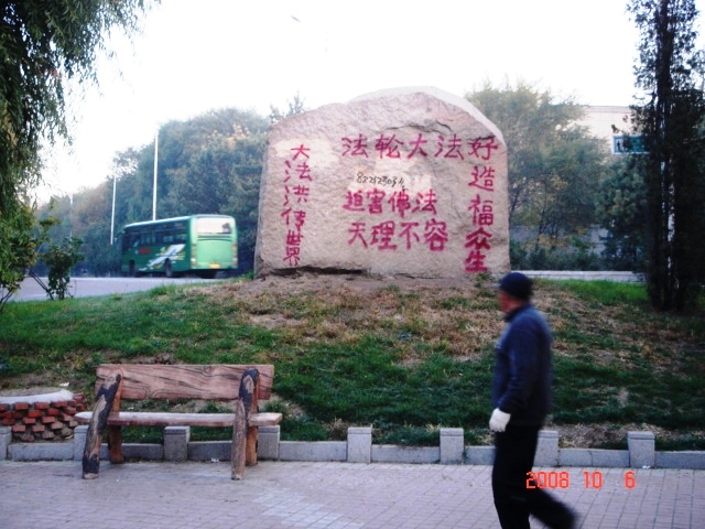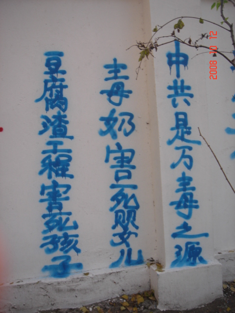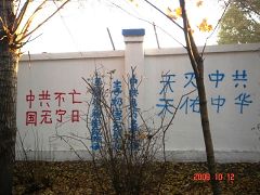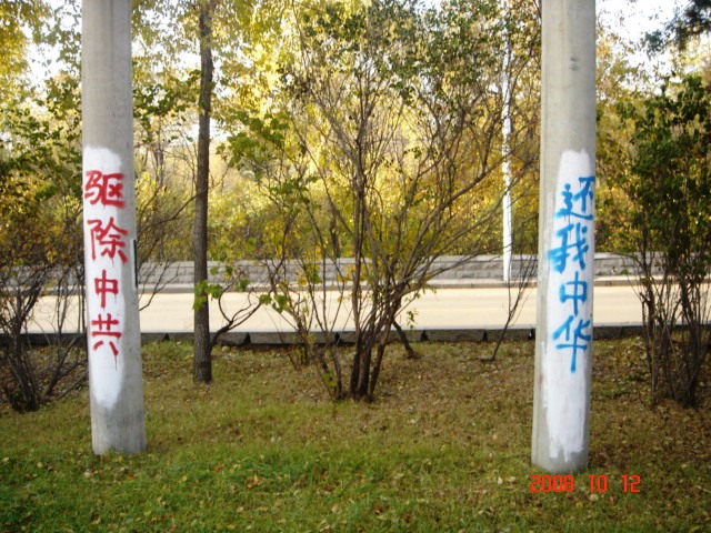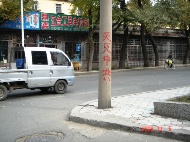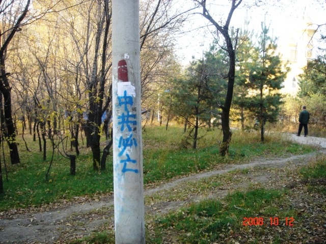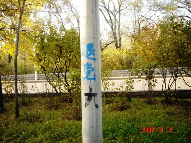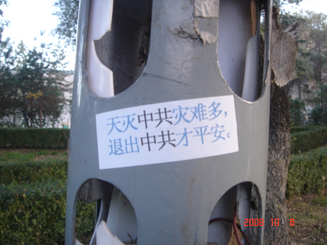 大陆北方某市出现大量退!党!标语,在公园的巨石上、在公园里的假山上、道路两边的电线杆上、围墙上、家属楼的墙上、大树上及体育广场的立柱上等地方出现喷漆和不干胶标语——喷漆喷出的标语有:“天灭中共 天佑中华”、“退!党!保命”、“声援四千三百万人退!党!”、“驱除中共恶党,还我中华”、“恶党不亡,国无宁日”、“法轮大法好”、“中共毒奶害死婴孩、豆腐渣工程害死灾区孩子、中共是万毒之源”、“平反法轮功,法办江泽民”等;不干胶上写着:“天灭中共灾难多,退出中共才平安”、“追查迫害法轮功的国际组织”公布天安门自焚案是一出重大的阴谋栽赃陷害!、“中国大陆公安国安迫害法轮功,恶报知多少?”、“中国三大冤案:文革、六四、迫害法轮功”、“老百姓觉醒了”及退!党!声明等。