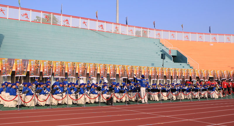 开场时天国乐团队伍进入操场中央,在司令台前演奏《法轮大法好》、《欢乐颂》、《你是我的兄弟》三首乐曲,乐音响彻云霄,赢得参赛选手和观礼民众的热烈掌声。退场后天国乐团紧接着引领来自全国参加消防竞技的弟兄进入大会会场,阵容壮大,整齐划一,赢得如雷掌声。