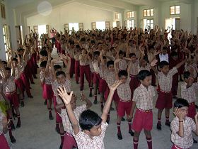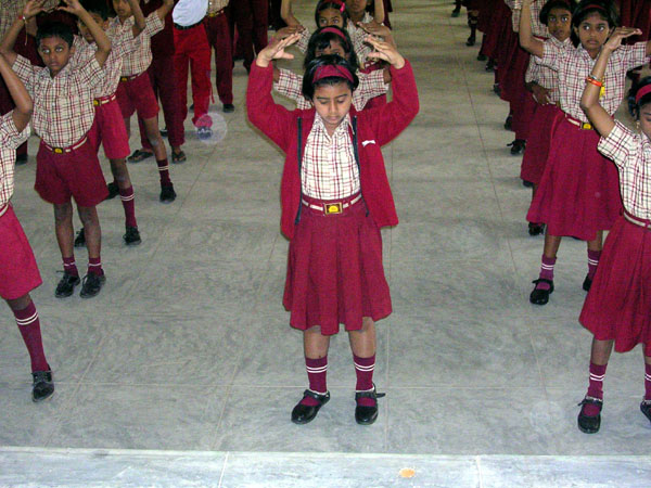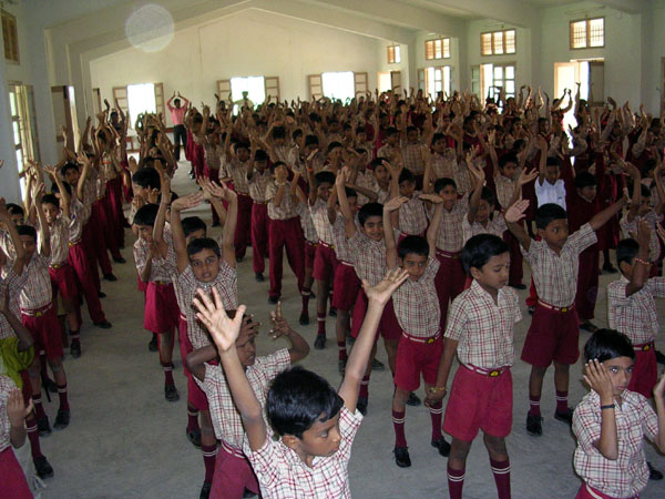 Chitra向校长介绍我们,短暂寒暄后,便召集学生至礼堂集体炼功。