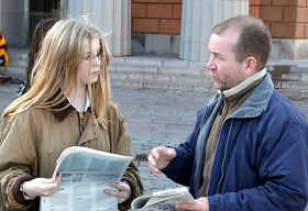 当天来看皇家换岗仪式的有很多是来自中国的游客,他们其中很多人都高兴的接过了法轮功学员递上的《·九·评*》及法轮功真相资料,但也有一些人连《大.纪.元;时报》都不敢接。这时有一位导游手里拿着一份报纸在旁边大声的说:“看看怕什么的,有什么大不了的!这儿的人都看这个报纸。”其中有三个来自北京的年轻人每人都收下了一套中文报纸和相关的法轮功真相资料,并高兴的说:“这才真是要好好学习学习的哪!谢谢啦!”