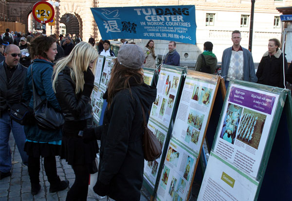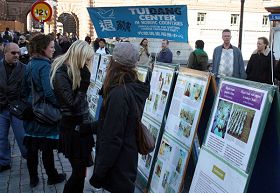 秋日的斯德哥尔摩气候十分宜人,红、黄色的树叶在蓝天的映衬下把整个城市妆扮的美丽壮观,这样的好天气自然吸引大量游人。人们成群结队的来到瑞典著名景点皇宫看换岗仪式。钱币广场(Mynttorg)是通向皇宫的必经之路。当他们路过这里的时候,不少人都被眼前的横幅与图片展板所吸引。