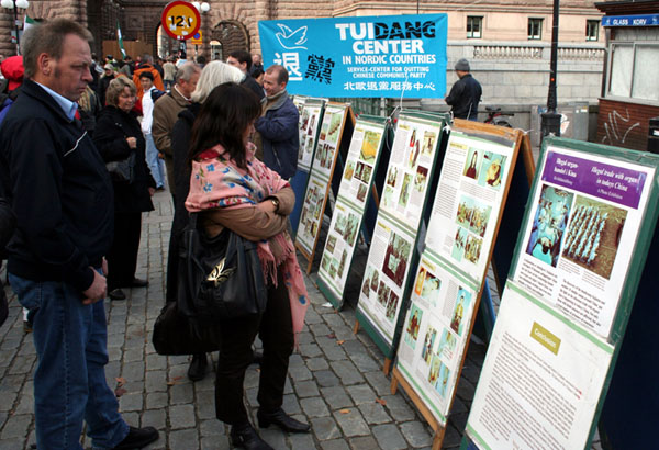 一对从英国来瑞典旅游的中年夫妇在仔细观看了揭露中共迫害的法轮功的展板后,那位男士指着《·九·评*共产党》资料对法轮功学员说:“在英国我就看过《·九·评*共产党》了,我相信中共倒台是早晚的事。”