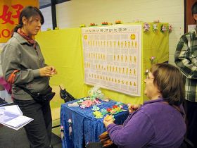 摊位上高悬着金黄色的“法轮大法好”横幅;法轮功学员伴着优美的炼功音乐,演示五套功法;桌上摆放着《法轮功》、《转法轮》等书籍及各种洪法讲真相资料。观众来时,学员们送上真相传单,还不时的递上一朵纸莲花,把法轮大法的美好和祝福带给人们。桌上还摆有征签簿,呼吁制止中共对法轮功的残酷迫害。前来参观的很多人主动签名。