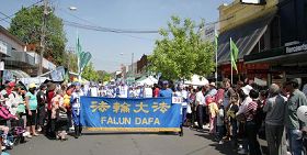 游行队伍经过主席台时,主持人通过喇叭向全场介绍:“法轮大法是一种气功修炼,以宇宙‘真善忍’的特性修炼心性,使修炼者返本归真。五套功法,动作缓慢易学,免费教功。炼法轮功会令人感到轻松愉快,使人精力充沛……”主席台上市议员和政府工作人员向法轮大法游行队伍鼓掌和挥手致意。