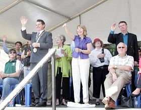 ![]() 主席台上市议员向法轮大法游行队伍挥手致意 |