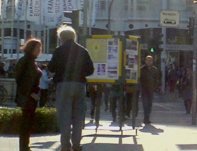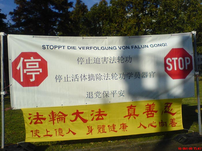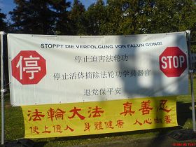 ![]() 法轮功学员在法兰克福展览中心前举办信息日活动 |
