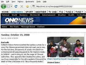![]() 2008年10月19日,新西兰国家电视一台“星期天(Sunday)”专题报导了对三鹿毒奶粉的调查。(网络截图) |