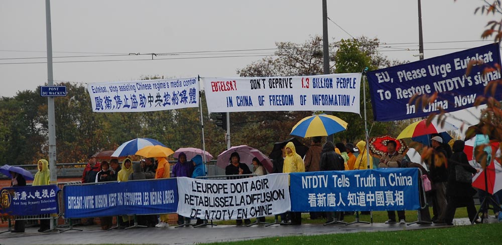 ![]() 支持者在欧洲议会前呼吁恢复新!唐!人:电视台对中国的播出信号 |