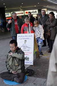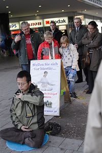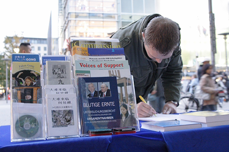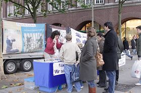 【明慧网二零零八年十月二十六日】二零零八年十月二十五日星期六,德国汉堡法轮功学员再次在汉堡市中心商业街上。整个下午,不断的有许多德国民众和海外华人前来询问关于法轮功在中国无辜被的事情。许多人在谴责中共迫害法轮功的签名表上郑重的写下了自己的名字。许多德国人看了揭露中共活摘法轮功学员器官的展板后,表示难过和愤慨。一些德国人让他们的孩子也来了解真相。