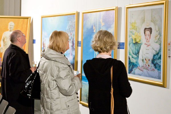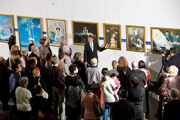 致辞之后,参加开幕式的人们在画展主办者德国“艺术和人权协会”会长第茨先生的解说下观赏了每一幅画,对于一些画作中表现的法轮功学员受到中共警察酷刑折磨的情景,很多人露出震惊的表情。也有很多人对表现法轮大法美好的画作很感兴趣。开幕式结束后一些人找到在场的法轮功学员询问学功事宜。