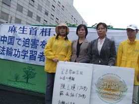 两位老人家在日本的女儿施萍与蒋晓燕以及她们的朋友共同谴责中共当局非法关押她们在上海的母亲。她们10月23日来到了东京永田町的日本国会前,向即将前往北京参加亚欧元首会议的麻生首相呼吁帮助营救自己的母亲。