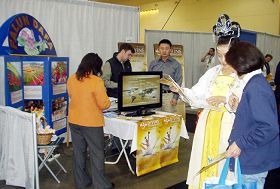 ![]() 法轮功学员向参观者讲真相及介绍神韵晚会 |