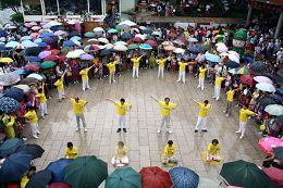 功法演示在雨中展开,撑着伞的民众,不断的聚集,一圈圈的围观,聚精会神的看着法轮功学员祥和的展示五套功法,有人赞叹说:腿盘的真好看!许多人当场询问炼功点,表示要开始学炼法轮功,主办单位表示感佩法轮功学员不畏风雨的精神,希望“真、善、忍”的精神可以发扬光大,让全世界的人都可以得到身心的健康。