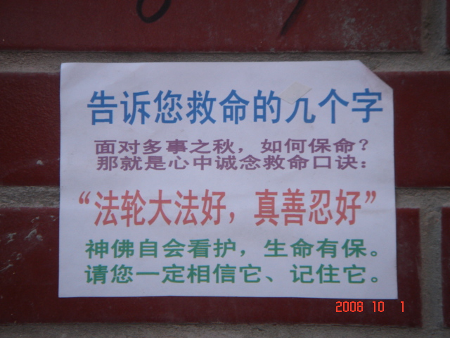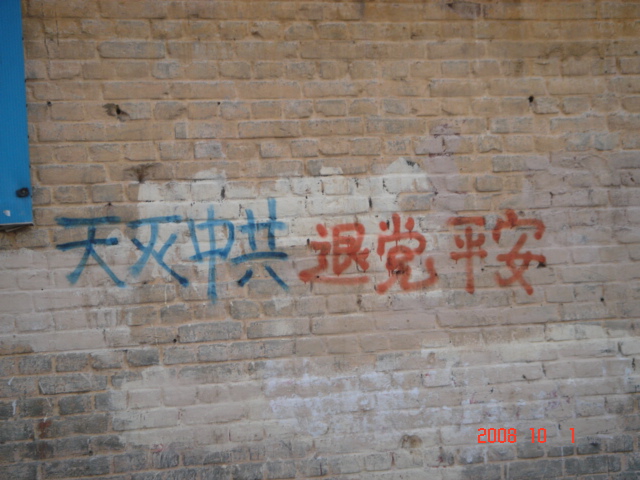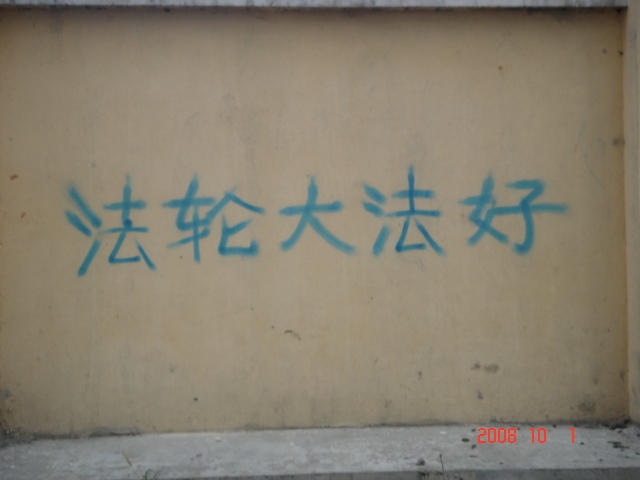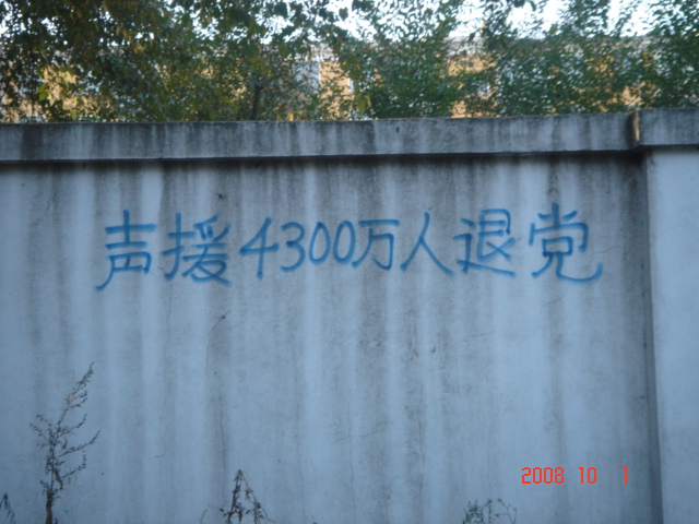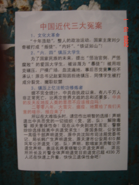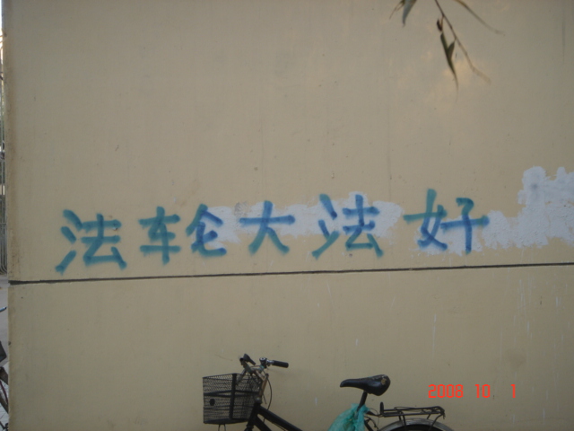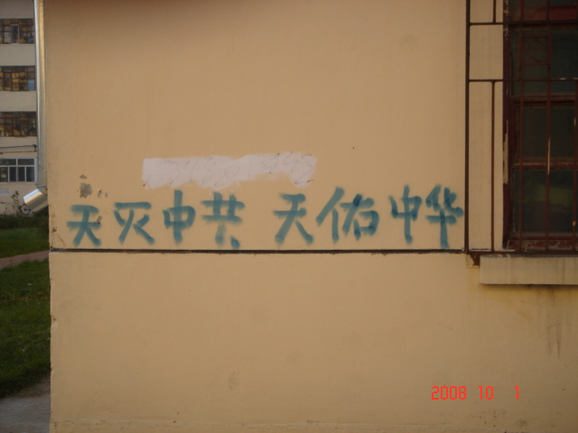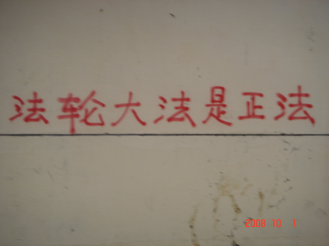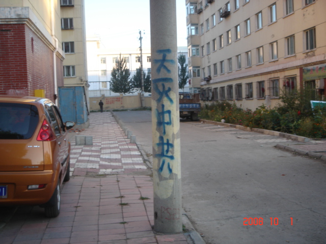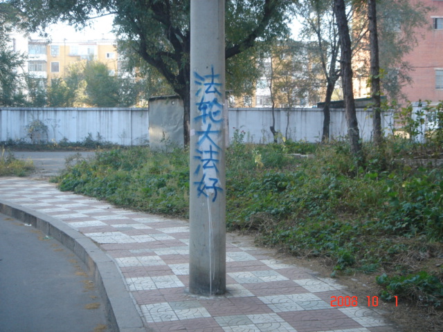在十月一日,中国大陆北方某城市出现了天灭中共以及为法轮功呐喊平反、法办江泽民的大量真相标语,在道路两边的电线杆上、围墙上、家属楼的墙上、大树上等出现喷漆和不干胶标语.喷漆喷出的标语有:“天灭中共”、“退!党!保命”、“声援四千三百万人退!党!”、“沈阳司法局长韩广生声明退!党!保命!”、“中央党校25名高官集体退!党!”、“贵州发现亿年奇石上书:中国共产党亡”、“法轮大法好”、“重庆大学研究生魏星艳因炼法轮功遭恶警强奸的迫害!法办凶手”、“信仰无罪,停止迫害”、“平反法轮功,法办江泽民”、“法轮功被迫害千古奇冤”等;不干胶上写着:“追查迫害法轮功的国际组织”公布天安门自焚案是一出重大的阴谋栽赃陷害!、“中国大陆公安国安迫害法轮功恶报知多少?”、“中国三大冤案:文革、六四、迫害法轮功”、“老百姓觉醒了”及退!党!声明等。