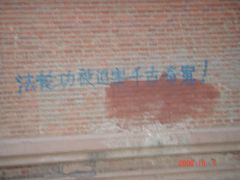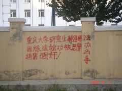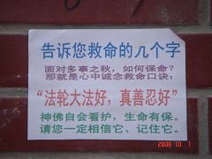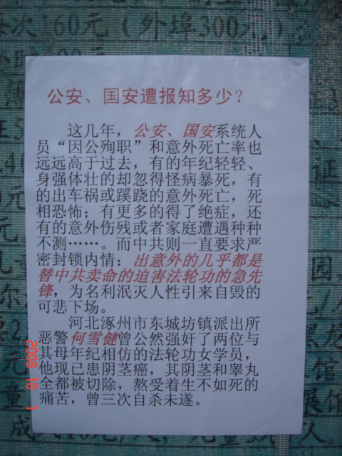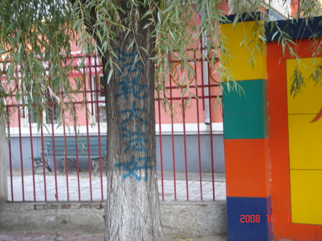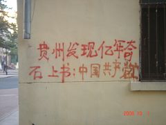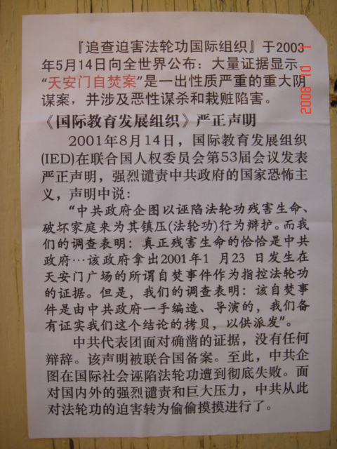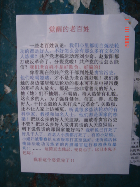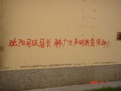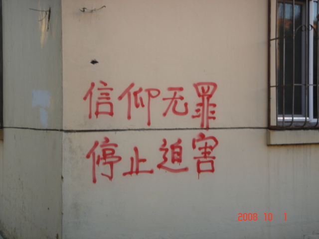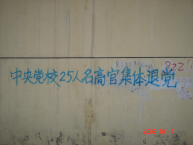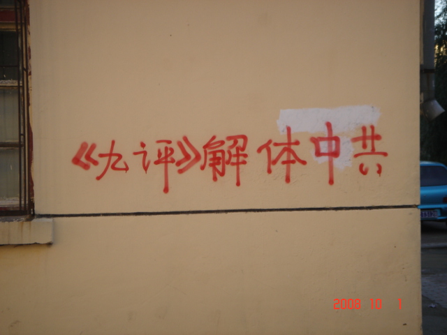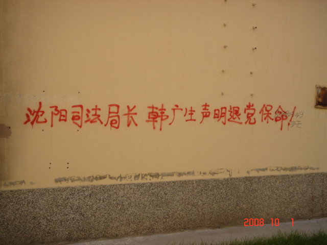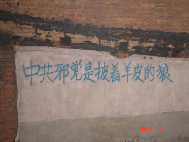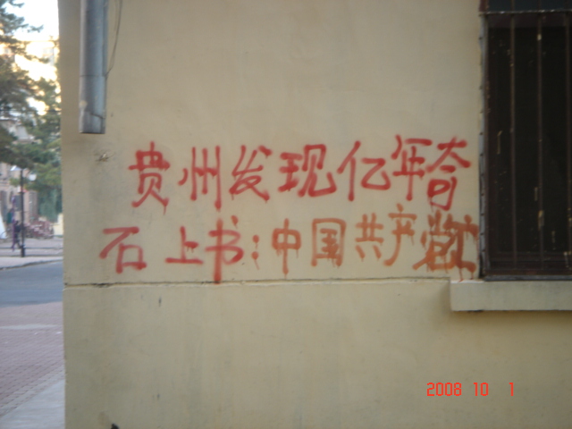 在十月一日,中国大陆北方某城市出现了天灭中共以及为法轮功呐喊平反、法办江泽民的大量真相标语,在道路两边的电线杆上、围墙上、家属楼的墙上、大树上等出现喷漆和不干胶标语.喷漆喷出的标语有:“天灭中共”、“退!党!保命”、“声援四千三百万人退!党!”、“沈阳司法局长韩广生声明退!党!保命!”、“中央党校25名高官集体退!党!”、“贵州发现亿年奇石上书:中国共产党亡”、“法轮大法好”、“重庆大学研究生魏星艳因炼法轮功遭恶警强奸的迫害!法办凶手”、“信仰无罪,停止迫害”、“平反法轮功,法办江泽民”、“法轮功被迫害千古奇冤”等;不干胶上写着:“追查迫害法轮功的国际组织”公布天安门自焚案是一出重大的阴谋栽赃陷害!、“中国大陆公安国安迫害法轮功恶报知多少?”、“中国三大冤案:文革、六四、迫害法轮功”、“老百姓觉醒了”及退!党!声明等。
